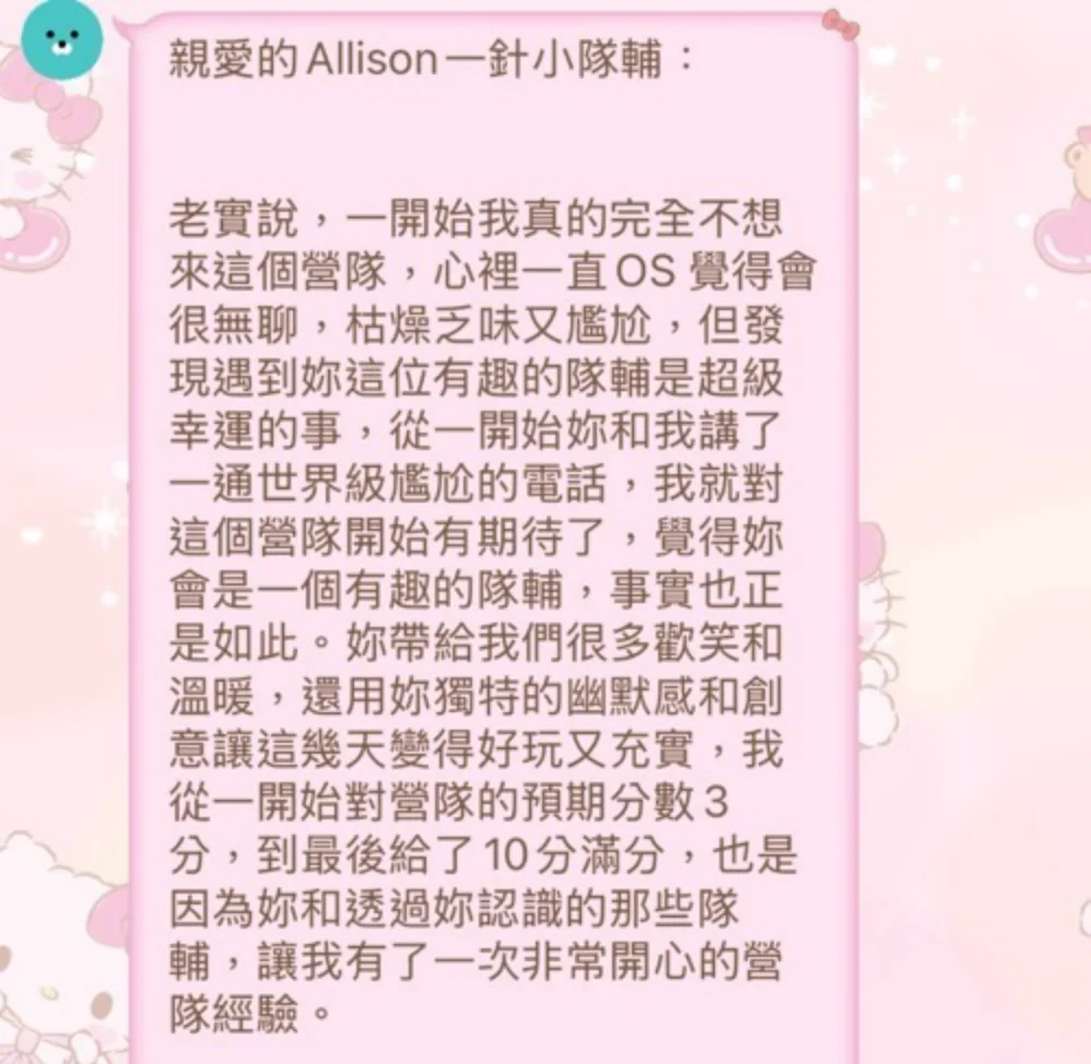 到了最後一天,那位原本是被家長逼來、只想交差了事的孩子,竟然後續還傳訊息跟她説:「一開始完全不想來這營隊,但發現遇到你這位有趣的隊輔是超級幸運的事。」羿蓁覺得這是作為陪伴者,感到最有意義的收穫。(如以上附圖)