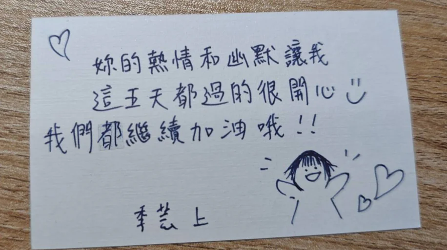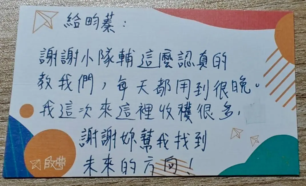 正是這種亦師亦友的鬆弛感,建立起與孩子間最真實的信任,讓原本緊繃的孩子卸下心防。甚至營隊結束要回家時,有位女孩竟然難捨難分的哭了,畇蓁開玩笑地哄著:「哎唷我還沒頭七,別哭!」但心裡其實很感動原來他們已經把他當作知心大姐姐,且看著孩子的回饋小卡讓畇蓁心裡明白:「這幾天下來的努力,真的有幫助到他們的感覺!」而感到滿滿成就感。