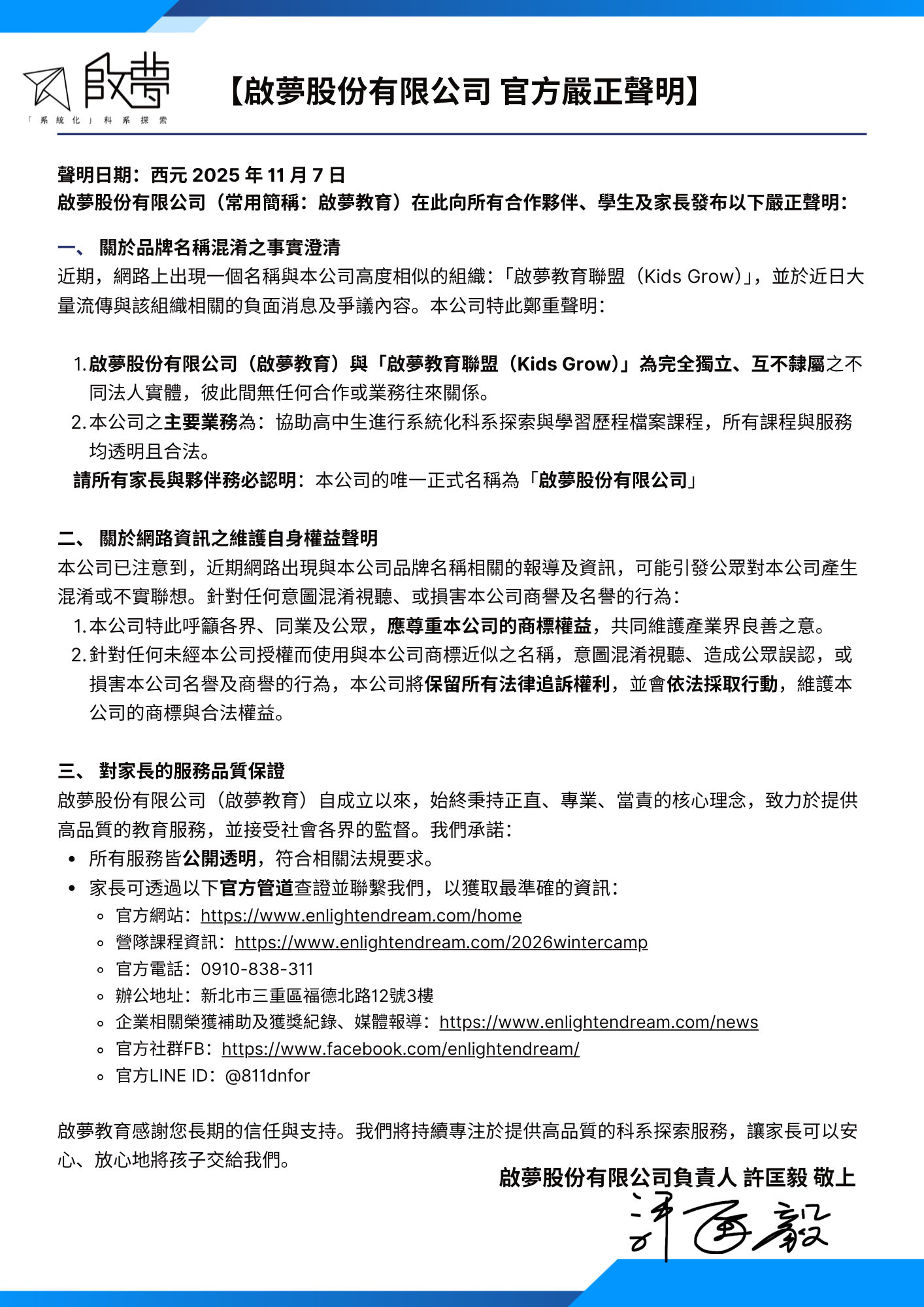 我是啟夢創辦人 Curry 老師,跟大家詳細說明如下:
